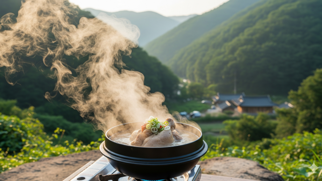 [김이 모락모락 피어오르는 전통 무쇠솥 닭백숙과 계곡 풍경이 어우러진 한국적 정서의 모습]