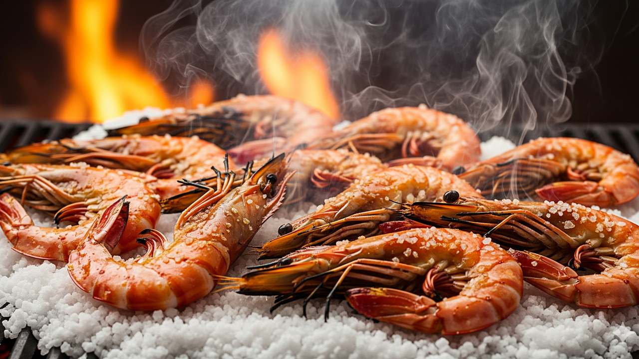 [굵은 소금 위에서 붉게 익어가는 대하들이 수증기와 함께 바삭하게 구워지는 모습]