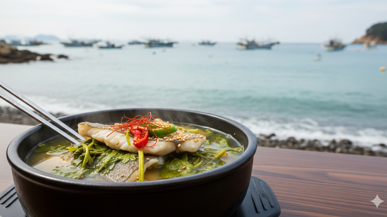 [통영 바다를 배경으로 신선한 도다리와 향긋한 봄쑥이 어우러진 도다리쑥국 한 그릇]