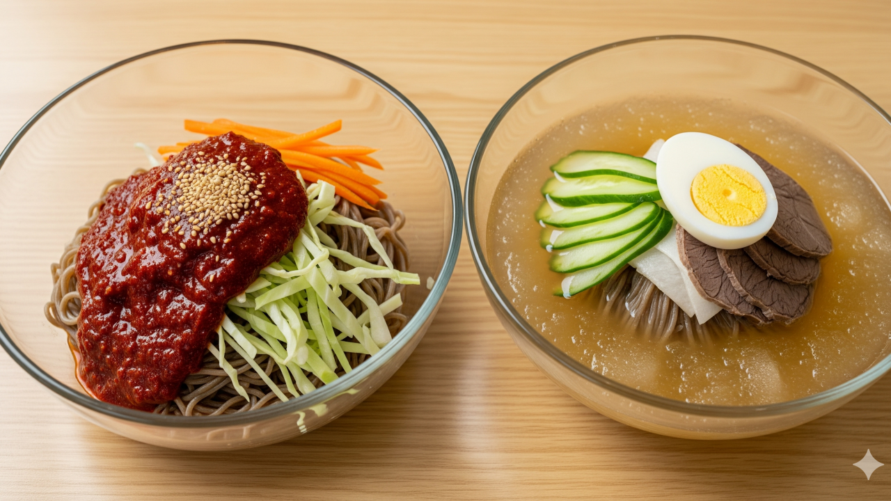 [투명한 유리그릇에 담긴 시원한 메밀막국수와 평양냉면이 나란히 놓여있는 모습]