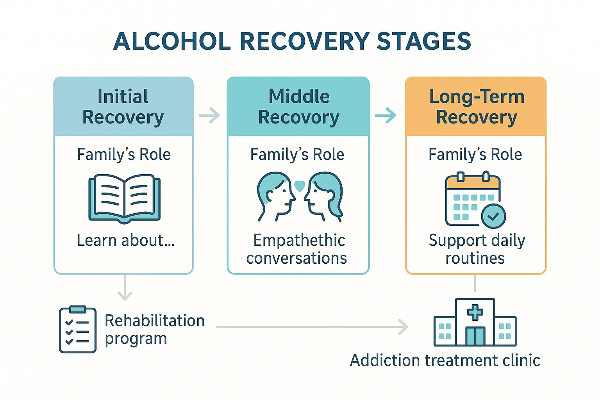 재발 방지 기술 습득, 건강한 생활 습관 형성, 관계 개선 시작 | 꾸준한 격려와 지지, 건강한 생활 함께 실천, 작은 성공 칭찬, 의사소통 연습 | 함께 자조모임 참석(알아넌 등), 규칙적인 가족 식사, 공동의 비알코올 취미 활동 | 재발 경고 신호 파악 및 대처, 가족 내 갈등 중재, 공동의존 패턴 점검 |