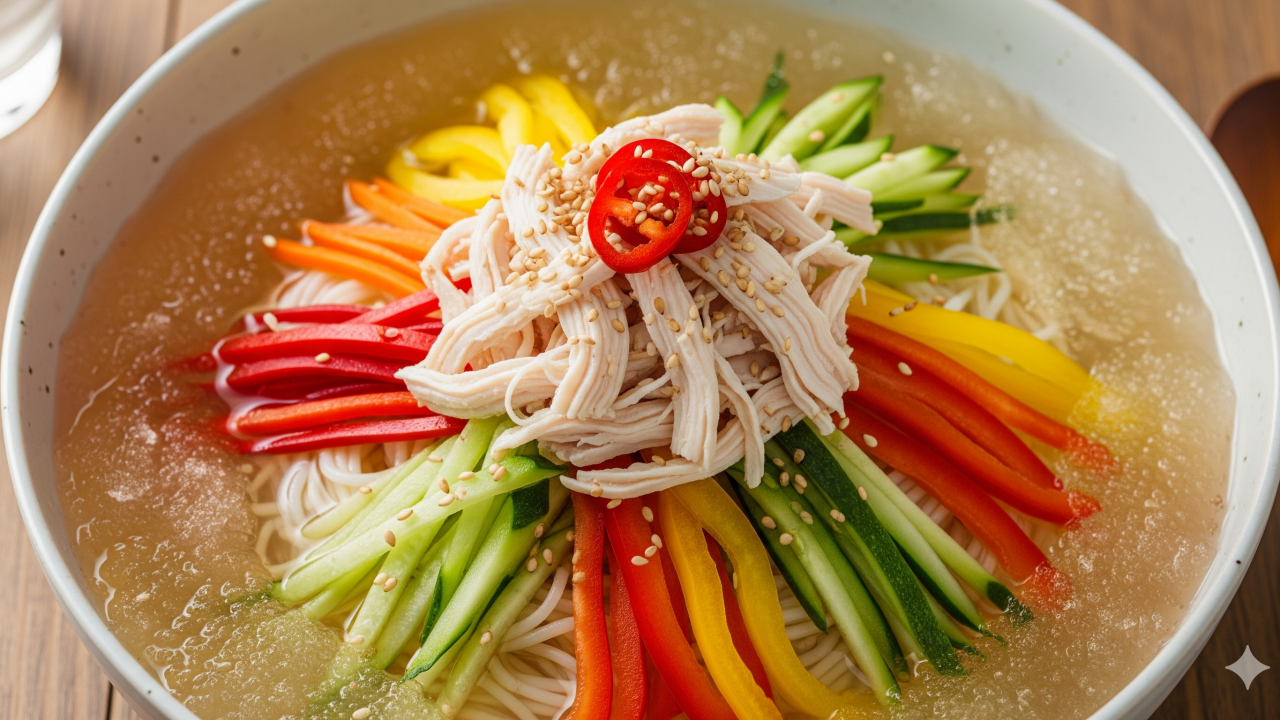 [투명한 육수에 색색의 채소와 닭가슴살이 올라간 초계국수 한 그릇]