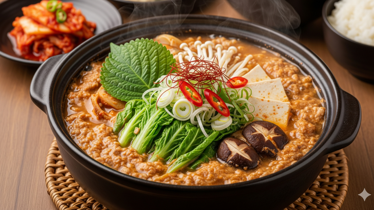 [추어탕의 진한 국물과 풍성한 재료가 담긴 뚝배기 이미지]