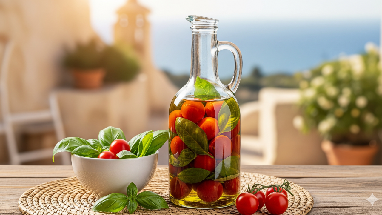[투명한 유리병에 담긴 붉은 방울토마토 마리네이드, 올리브오일과 바질이 어우러진 지중해식 비주얼]